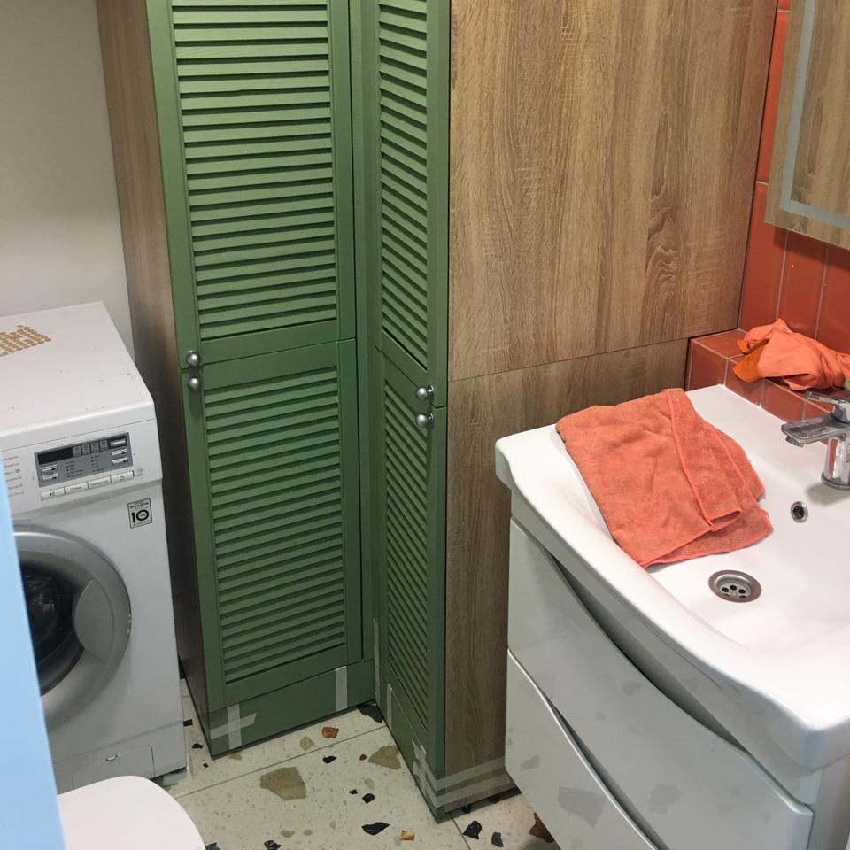 Данный шкаф позволит избавиться от внешних раздражителей в вашей ванны. Специальные отсеки позволят расположить в шкафу стиральную машинку, полотенца, а также другую утварь.